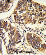 Formalin-fixed and paraffin-embedded human lung carcinoma reacted with PABPC1 Antibody (Center), which was peroxidase-conjugated to the secondary antibody, followed by DAB staining. This data demonstrates the use of this antibody for immunohistochemistry; clinical relevance has not been evaluated. |