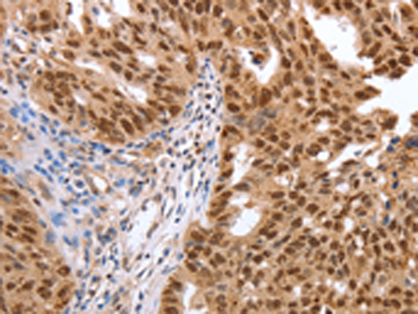 The image is immunohistochemistry of paraffin-embedded Human ovarian cancer tissue using P11308(PARP1 Antibody) at dilution 1/40. (Original magnification: ×200) |