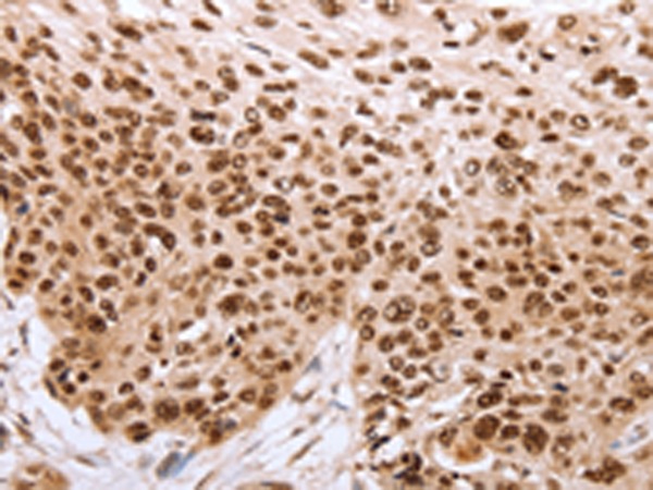 The image is immunohistochemistry of paraffin-embedded Human esophagus cancer tissue using P11308(PARP1 Antibody) at dilution 1/40. (Original magnification: ×200) |