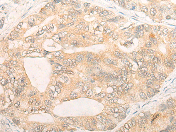 The image is immunohistochemistry of paraffin-embedded Human gastric cancer tissue using P05138(PARP3 Antibody) at dilution 1/20. (Original magnification: ×200) |