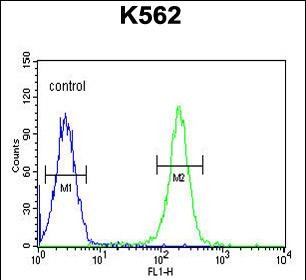 PAX1 Antibody (C-term) (Cat. #P30788) flow cytometric analysis of K562 cells (right histogram) compared to a negative control cell (left histogram).FITC-conjugated goat-anti-rabbit secondary antibodies were used for the analysis. |