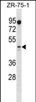 PBX2 Antibody (Center) (Cat. #P31571) western blot analysis in ZR-75-1 cell line lysates (35ug/lane).This demonstrates the PBX2 antibody detected the PBX2 protein (arrow). |