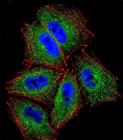 Confocal immunofluorescent analysis of PCDHAC2 Antibody (Center)(Cat#P31045) with NCI-H460 cell followed by Alexa Fluor 488-conjugated goat anti-rabbit lgG (green). Actin filaments have been labeled with Alexa Fluor 555 phalloidin (red).DAPI was used to stain the cell nuclear (blue). |