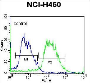 PCDHAC2 Antibody (Center) (Cat. #AP31967) flow cytometric analysis of NCI-H460 cells (right histogram) compared to a negative control cell (left histogram).FITC-conjugated donkey-anti-rabbit secondary antibodies were used for the analysis. |