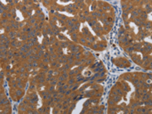 The image is immunohistochemistry of paraffin-embedded Human ovarian cancer tissue using P11311(PDCD2 Antibody) at dilution 1/10. (Original magnification: ×200) |