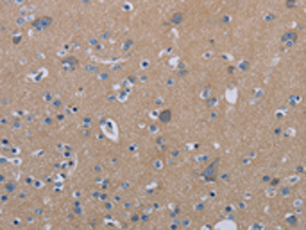 The image is immunohistochemistry of paraffin-embedded Human brain tissue using P12035(PDE4D Antibody) at dilution 1/20. (Original magnification: ×200) |