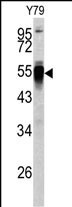 Western blot analysis of PDIA6 antibody (Center K159) (Cat.# P32745) in Y79 cell line lysates (35ug/lane). PDIA6 (arrow) was detected using the purified Pab. |