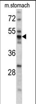 Western blot analysis of PDIA6 antibody (Center K159) (Cat.# P32745) in mouse stomach tissue lysates (35ug/lane). PDIA6 (arrow) was detected using the purified Pab. |