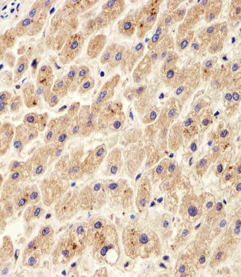 Immunohistochemical analysis of paraffin-embedded H. liver section using PDIA6 Antibody (Center K159)(Cat#P32745). P32745 was diluted at 1:100 dilution. A peroxidase-conjugated goat anti-rabbit IgG at 1:400 dilution was used as the secondary antibody, followed by DAB staining. |