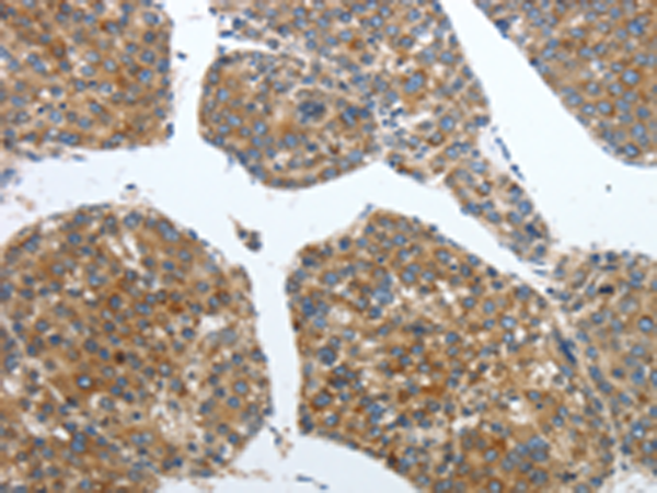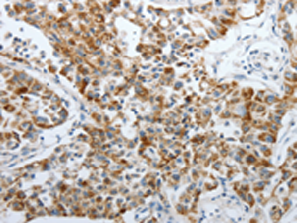 The image is immunohistochemistry of paraffin-embedded Human liver cancer tissue using P04171(PDK2 Antibody) at dilution 1/40. (Original magnification: ×200) |