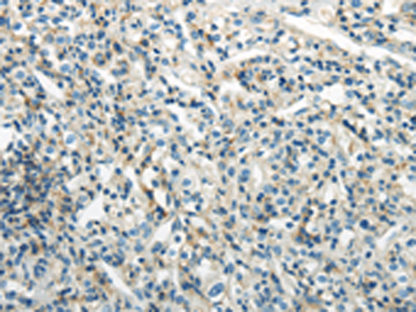 The image is immunohistochemistry of paraffin-embedded Human thyroid cancer tissue using P05541(PDPN Antibody) at dilution 1/25. (Original magnification: ×200) |