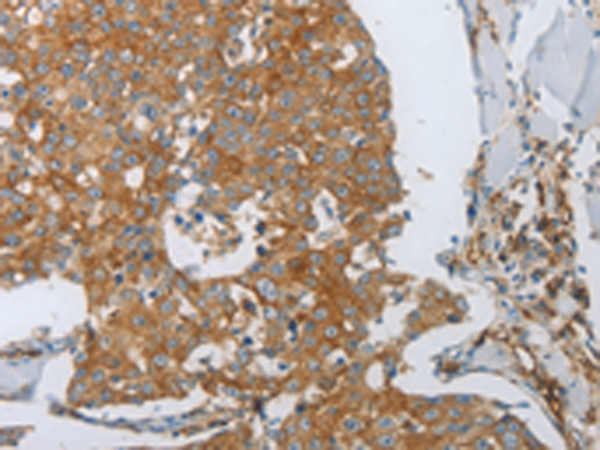 The image is immunohistochemistry of paraffin-embedded Human breast cancer tissue using P11087(PECAM1 Antibody) at dilution 1/30. (Original magnification: ×200) |