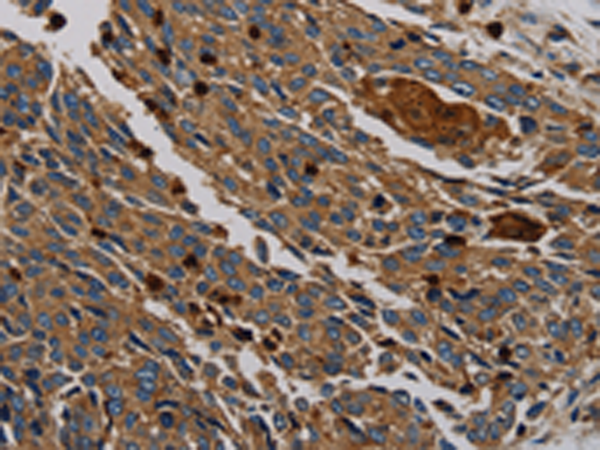 The image is immunohistochemistry of paraffin-embedded Human thyroid cancer tissue using P12040(PER2 Antibody) at dilution 1/50. (Original magnification: ×200) |