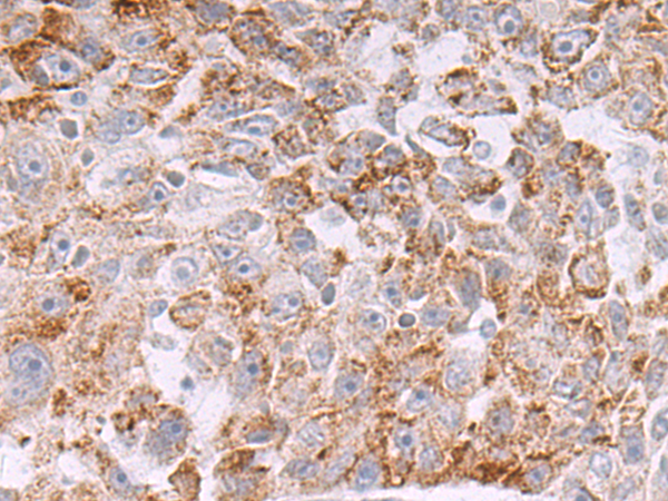 The image is immunohistochemistry of paraffin-embedded Human liver cancer tissue using P06895(PEX14 Antibody) at dilution 1/50. (Original magnification: ×200) |