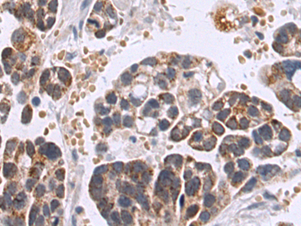The image is immunohistochemistry of paraffin-embedded Human colorectal cancer tissue using P06895(PEX14 Antibody) at dilution 1/50. (Original magnification: ×200) |