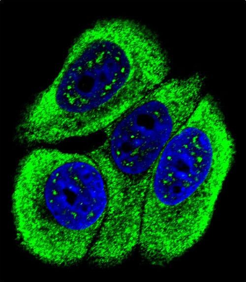 Confocal immunofluorescent analysis of Phospho-ABL1-Y251 Antibody(Cat#P30116) with MCF-7 cell followed by Alexa Fluor 488-conjugated goat anti-rabbit lgG (green). DAPI was used to stain the cell nuclear (blue). |