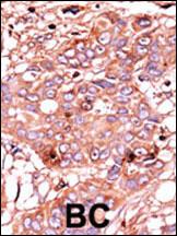 Formalin-fixed and paraffin-embedded human cancer tissue reacted with the primary antibody, which was peroxidase-conjugated to the secondary antibody, followed by AEC staining. This data demonstrates the use of this antibody for immunohistochemistry; clinical relevance has not been evaluated. BC = breast carcinoma; HC = hepatocarcinoma. |