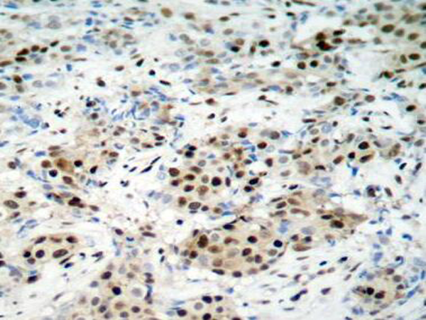 The image is immunohistochemistry of paraffin-embedded Human breast carcinoma tissue using CREB1(Phospho-Ser133 Antibody) at dilution 1/50 (Original magnification: ×200) |