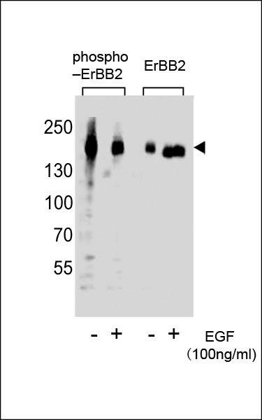 Western blot analysis of extracts from A431 cells,untreated or treated with EGF,100ng/ml ,using phospho ERBB2-Y1127(left) or ERBB2 antibody(right) |