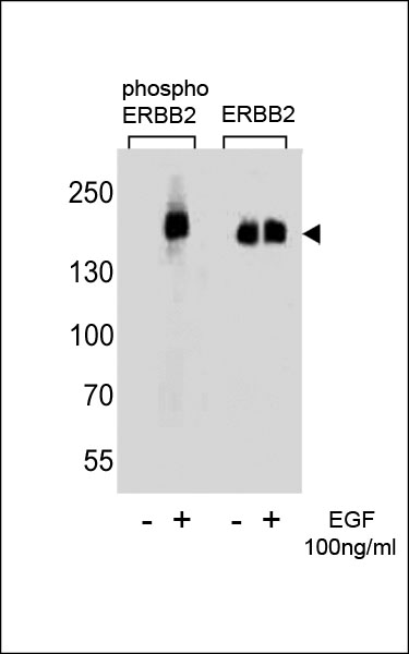 Western blot analysis of extracts from A431 cells, untreated or treated with EGF, 100ng/ml, using Phospho-ERBB2-Y1127 or ERBB2 antibody(right). |