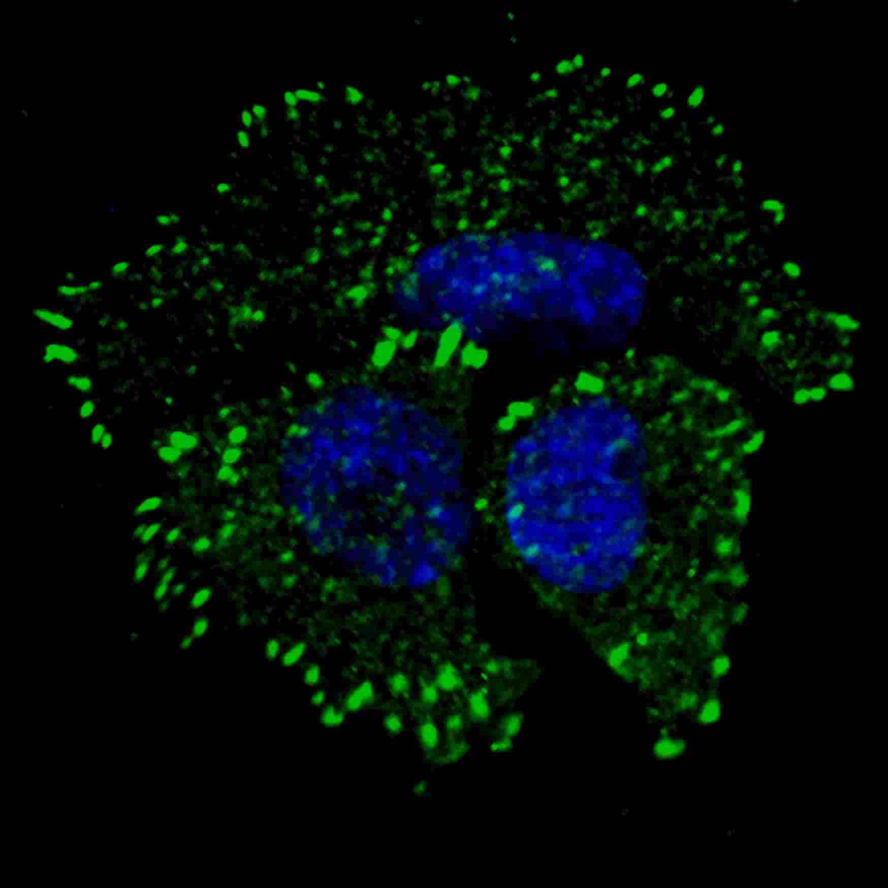 Fluorescent confocal image of MCF7 cells stained with phospho-ERBB2-Y1127 antibody. MCF7 cells were fixed with 4% PFA (20 min), permeabilized with Triton X-100 (0.2%, 30 min). Cells were then incubated with P32078 phospho-ERBB2- Y1127 primary antibody (1:100, 2 h at room temperature). For secondary antibody, Alexa Fluor® 488 conjugated donkey anti-rabbit antibody (green) was used (1:1000, 1h). Nuclei were counterstained with Hoechst 33342 (blue) (10 μg/ml, 5 min). Note the highly specific localization of the phospho-ERBB2-Y1127 to the plasma membrane and cytoplasm. |