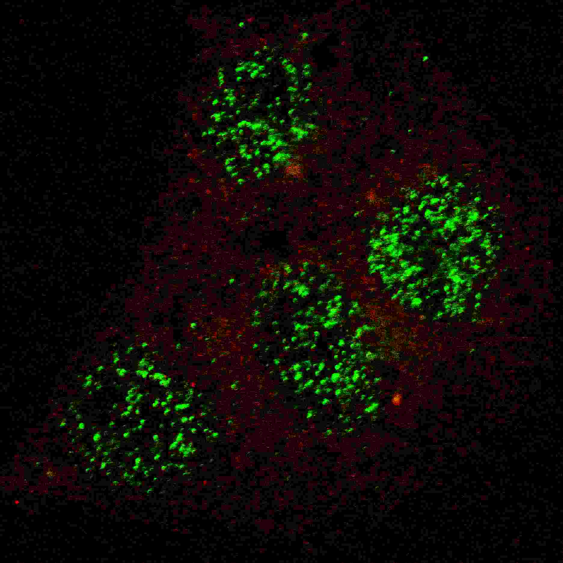 Fluorescent confocal image of HepG2 cells stained with phospho-GATA6-Y271 antibody. HepG2 cells were fixed with 4% PFA (20 min), permeabilized with Triton X-100 (0.2%, 30 min). Cells were then incubated with P31563 phospho-GATA6-Y271 primary antibody (1:100, 2 h at room temperature). For secondary antibody, Alexa Fluor® 488 conjugated donkey anti-rabbit antibody (green) was used (1:1000, 1h). Nuclei were counterstained with Hoechst 33342 (blue) (10 μg/ml, 5 min). Note the highly specific localization of the phospho-GATA6 immunosignal mainly to the nucleus. |