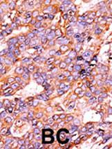 Formalin-fixed and paraffin-embedded human cancer tissue reacted with the primary antibody, which was peroxidase-conjugated to the secondary antibody, followed by AEC staining. This data demonstrates the use of this antibody for immunohistochemistry; clinical relevance has not been evaluated. BC = breast carcinoma; HC = hepatocarcinoma. |