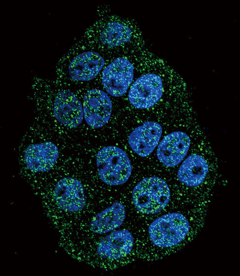 Confocal immunofluorescent analysis of Phospho-IRAK1-S376 Antibody(Cat#P30126) with Hela cell followed by Alexa Fluor 488-conjugated goat anti-rabbit lgG (green). DAPI was used to stain the cell nuclear (blue). |