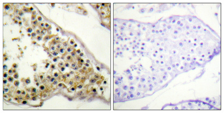 Immunohistochemistry analysis of paraffin-embedded Human testis using Phospho-ITK (Tyr512) antibody.High-pressure and temperature Sodium Citrate pH 6.0 was used for antigen retrieval. Sample with blocking peptide on the right. |