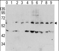 Western blot analysis of Phospho-MYC-T58 Antibody in human TPA activated Hela cell line lysates. Phospho-MYC (arrow) was detected using the purified PAb. (0: without TPA; 1: 60ug/ml TPA, 15min; 2: 60ug/ml TPA, 30min; 3: 60ug/ml TPA, 45min; 4: 125ug/ml TPA, 15min; 5: 125ug/ml TPA, 30min; 6: 125ug/ml TPA, 45min; 7: 250ug/ml TPA, 15min; 8: 250ug/ml TPA, 30min; 9: 250ug/ml, 45min) |