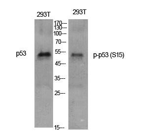 Western blot analysis of Phospho-p53 (Ser15) in untreated and Phospho-p53 (Ser15) treated with HU in 293T lysates using Phospho-p53 (Ser15) antibody |