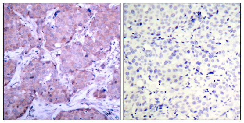 Immunohistochemistry analysis of paraffin-embedded Human breast carcinoma tissue using Phospho-PTEN (Ser380) antibody.High-pressure and temperature Sodium Citrate pH 6.0 was used for antigen retrieval.Sample with blocking peptide on the right. |