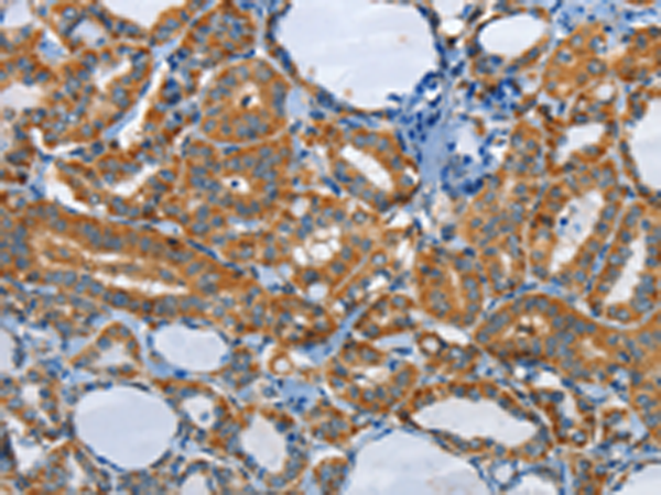 The image is immunohistochemistry of paraffin-embedded Human thyroid cancer tissue using P11512(PIK3R4 Antibody) at dilution 1/85. (Original magnification: ×200) |