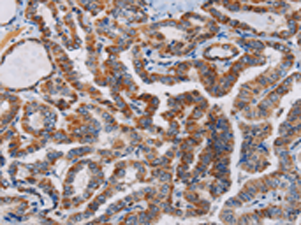 The image is immunohistochemistry of paraffin-embedded Human thyroid cancer tissue using P05168(PLCB3 Antibody) at dilution 1/40. (Original magnification: ×200) |