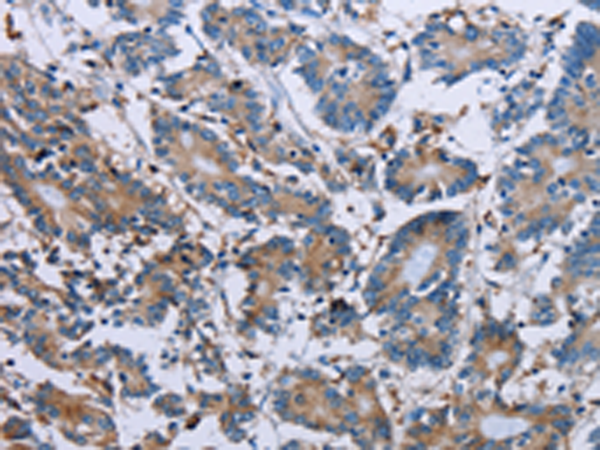 The image is immunohistochemistry of paraffin-embedded Human colon cancer tissue using P12067(PLG Antibody) at dilution 1/40. (Original magnification: ×200) |