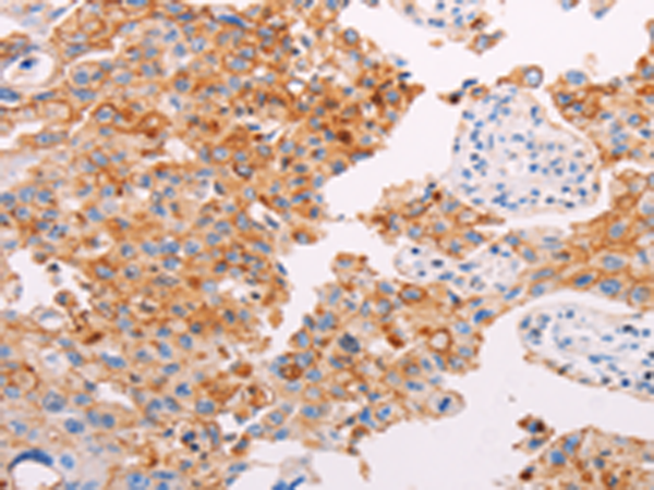 The image is immunohistochemistry of paraffin-embedded Human lung cancer tissue using P11432(PLIN2 Antibody) at dilution 1/25. (Original magnification: ×200) |