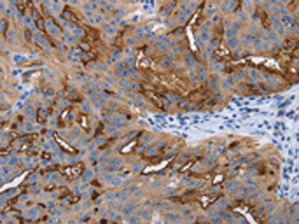 The image is immunohistochemistry of paraffin-embedded Human ovarian cancer tissue using P04416(PODXL Antibody) at dilution 1/25. (Original magnification: ×200) |
