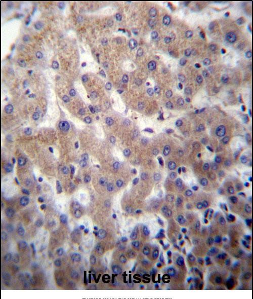 POFUT2 Antibody (Center) (Cat. #P31179)immunohistochemistry analysis in formalin fixed and paraffin embedded human liver tissue followed by peroxidase conjugation of the secondary antibody and DAB staining.This data demonstrates the use of POFUT2 Antibody (Center) for immunohistochemistry. Clinical relevance has not been evaluated. |