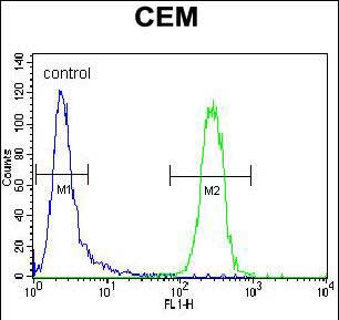 POLG Antibody (C-term) (Cat. #P31564) flow cytometric analysis of CEM cells (right histogram) compared to a negative control cell (left histogram).FITC-conjugated goat-anti-rabbit secondary antibodies were used for the analysis. |