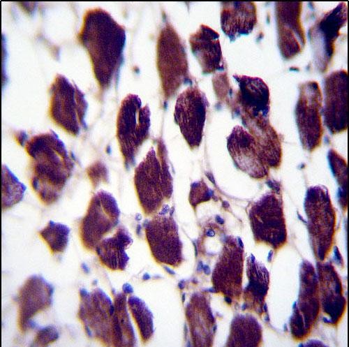POLG Antibody (C-term) (Cat. #P31564)immunohistochemistry analysis in formalin fixed and paraffin embedded human skeletal muscle followed by peroxidase conjugation of the secondary antibody and DAB staining.This data demonstrates the use of POLG Antibody (C-term) for immunohistochemistry. Clinical relevance has not been evaluated. |
