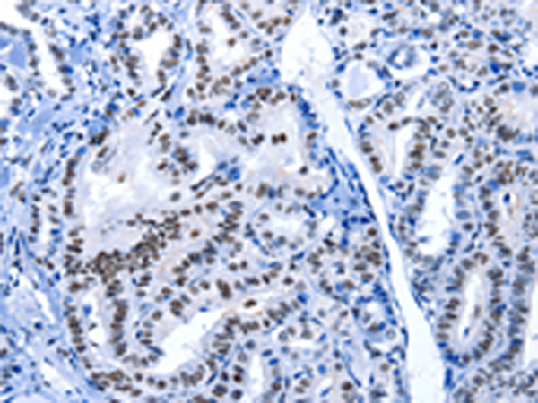 The image is immunohistochemistry of paraffin-embedded Human thyroid cancer tissue using P03790(POU2AF1 Antibody) at dilution 1/15. (Original magnification: ×200) |