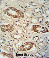 PPM1L antibody (C-term) (Cat. #P30889) immunohistochemistry analysis in formalin fixed and paraffin embedded human lung tissue followed by peroxidase conjugation of the secondary antibody and DAB staining. This data demonstrates the use of the PPM1L antibody (C-term) for immunohistochemistry. Clinical relevance has not been evaluated. |