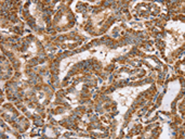 The image is immunohistochemistry of paraffin-embedded Human thyroid cancer tissue using P12074(PPOX Antibody) at dilution 1/40. (Original magnification: ×200) |