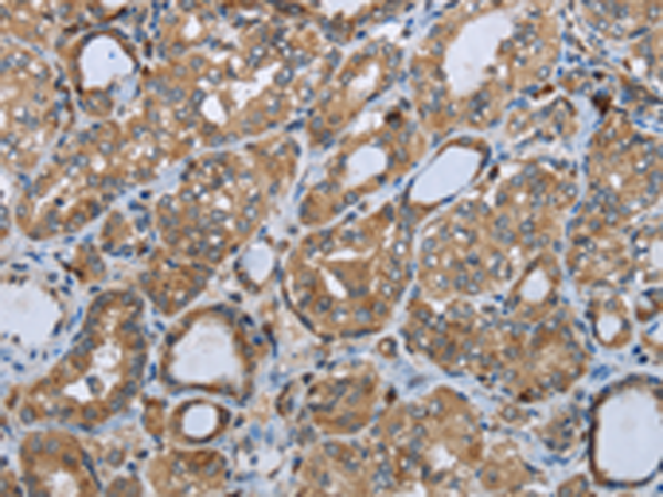 The image is immunohistochemistry of paraffin-embedded Human thyroid cancer tissue using P04040(PPP1R13L Antibody) at dilution 1/30. (Original magnification: ×200) |