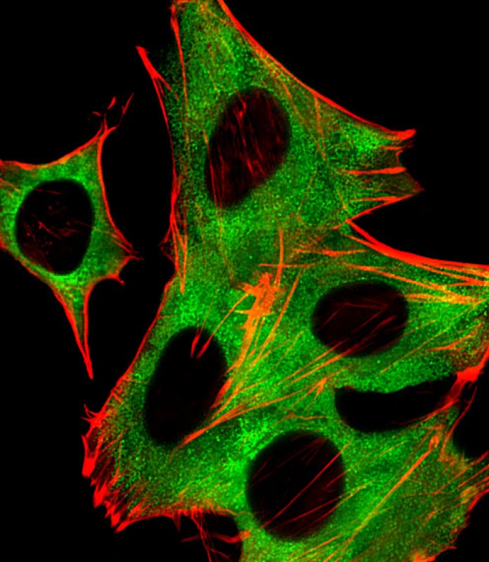 Fluorescent image of SH-SY5Y cells stained with PPP2R5B Antibody (C-term)(Cat#P32853). P32853 was diluted at 1:25 dilution. An Alexa Fluor 488-conjugated goat anti-rabbit lgG at 1:400 dilution was used as the secondary antibody (green). Cytoplasmic actin was counterstained with Alexa Fluor® 555 conjugated with Phalloidin (red). |