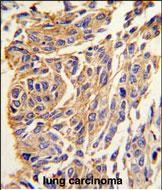 Formalin-fixed and paraffin-embedded human lung carcinoma tissue reacted with PPT1 antibody (C-term) (Cat. #P30082), which was peroxidase-conjugated to the secondary antibody, followed by DAB staining. This data demonstrates the use of this antibody for immunohistochemistry; clinical relevance has not been evaluated. |