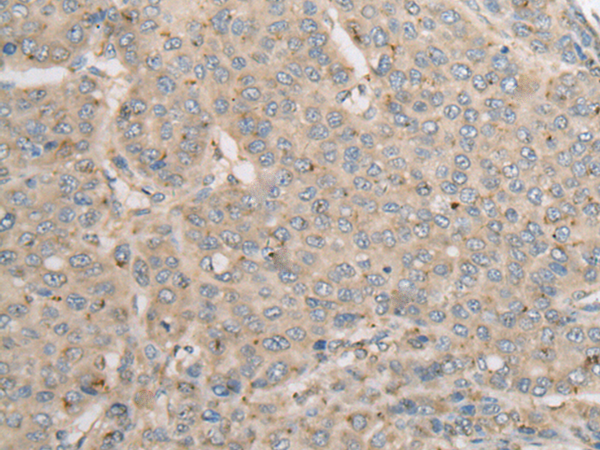 The image is immunohistochemistry of paraffin-embedded Human liver cancer tissue using P13017(PRKACA Antibody) at dilution 1/30. (Original magnification: ×200) |