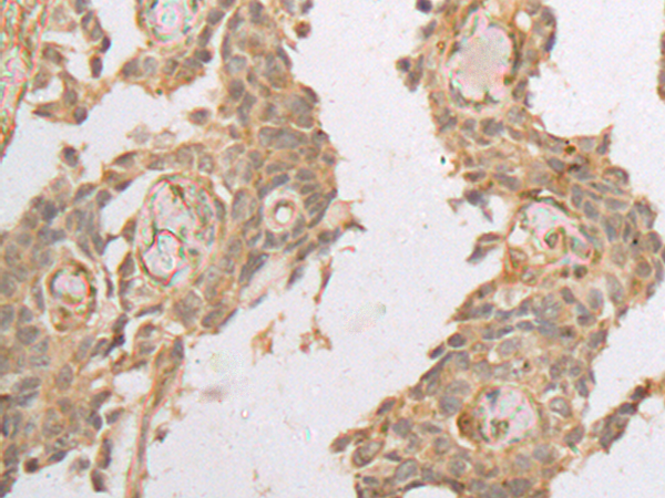 The image is immunohistochemistry of paraffin-embedded Human ovarian cancer tissue using P13017(PRKACA Antibody) at dilution 1/30. (Original magnification: ×200) |