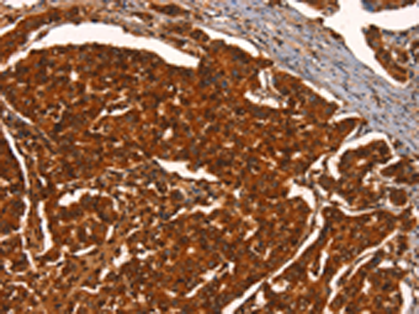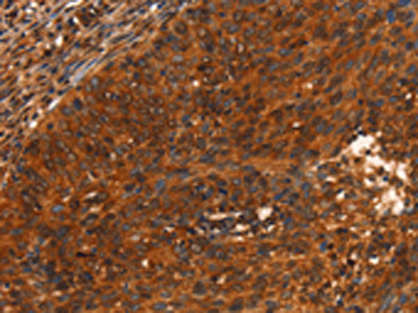 The image is immunohistochemistry of paraffin-embedded Human cervical cancer tissue using P04305(PRKD1 Antibody) at dilution 1/40. (Original magnification: ×200) |