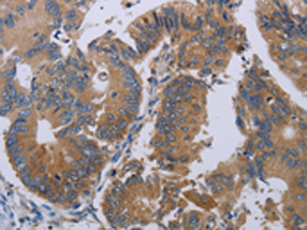 The image is immunohistochemistry of paraffin-embedded Human colon cancer tissue using P11212(PRKD3 Antibody) at dilution 1/50. (Original magnification: ×200) |